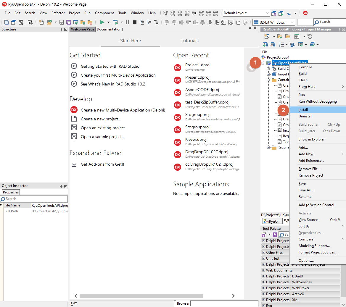 - 델파이에서 “Ryu Open Tools API” 폴더 안에 있는 “RyuOpenToolsAPI.dpk” 파일을 열고 프로젝트 파일 위에서 오른쪽 마우스 버튼을 클릭합니다.